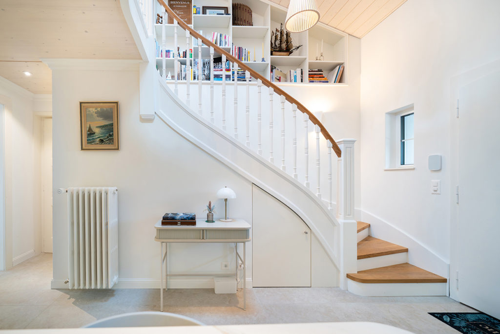 Chaque détail a été travaillé avec respect. Moulures conservées, intersections soignées, bois lasuré pour révéler sa texture originelle. La verticalité devient un langage, les espaces se glissent les uns dans les autres, les portes coulissent invisibles, les nombreux rangements se fondent dans la structure.