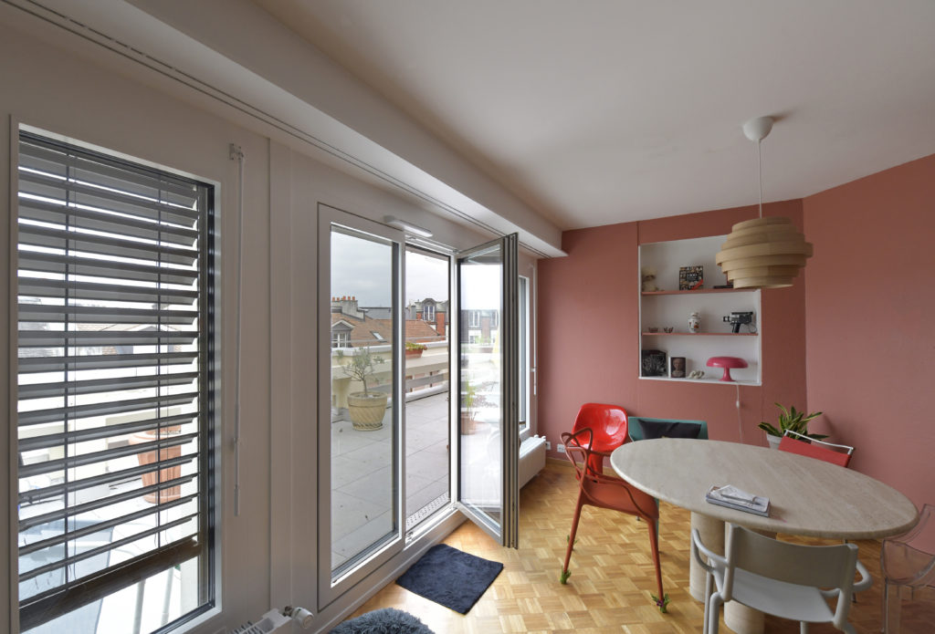 Intervention sur la toiture, isolation complète, création d’une toiture végétalisée et intégration discrète des nouvelles installations techniques, avec dispositifs limitant l’impact visuel et acoustique.